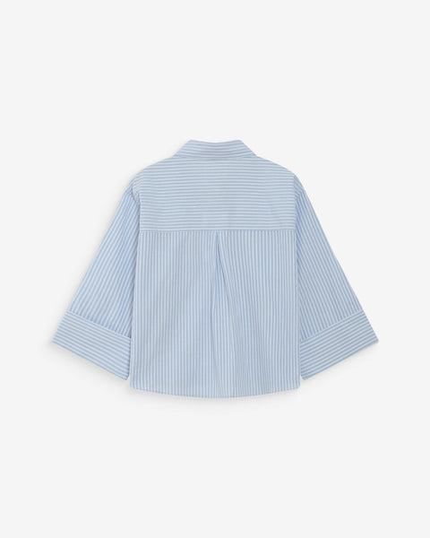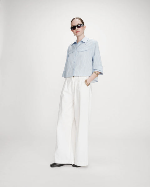 Het gestreepte VOICE-shirt heeft een korte, rechte snit. De 3/4 mouwen eindigen in brede manchetten. De klassieke kraag en de klepzakken op de borst bieden een moderne herinterpretatie van het traditionele werkshirt. De verticale strepen verlengen het silhouet optisch. De knoopsluiting aan de voorkant van het cropped VOICE-shirt en de plooi op de rug geven het silhouet subtiele structuur.