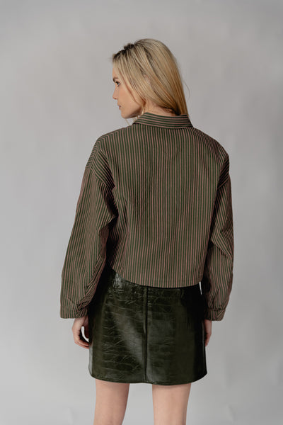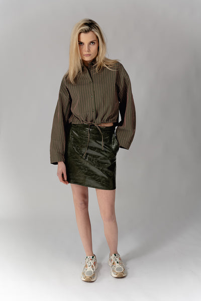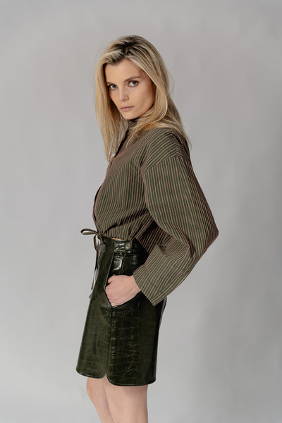 Blouse met strepen ( roze en khaki) en aantrekkoordje.