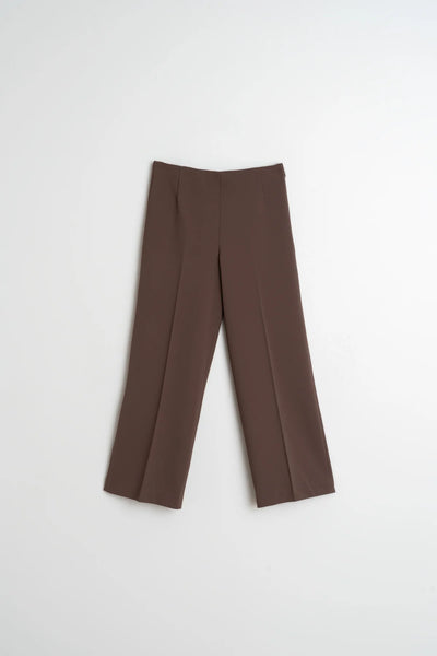 Een pantalon met een middelhoge taille en elastiek aan de binnenkant. Deze broek heeft een verborgen ritssluiting aan de zijkant en een rechte pijp, perfect voor een comfortabele maar toch verfijnde Look.