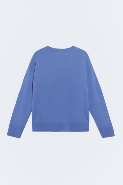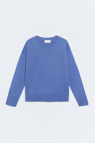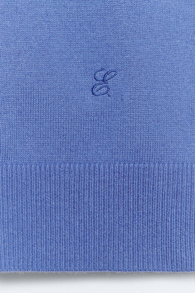 Basic 7-gauge gebreide trui. Blauwe kleur. Ronde hals. Lange mouwen. Stof van een mix van wol en katoen. Losse pasvorm. Geborduurd logo. Lengte kledingstuk voor maat S: 59,5 cm.