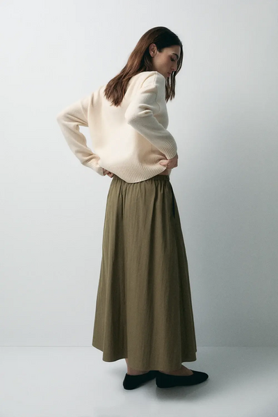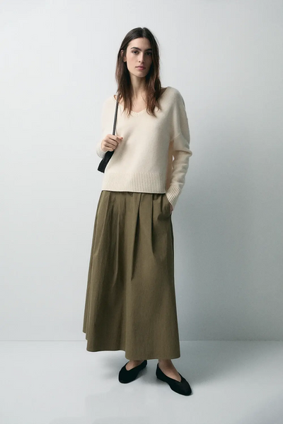 Middelgrote wollen trui. V-hals. Kort model. In ecru. Lengte kledingstuk voor maat S: 52,5 cm.