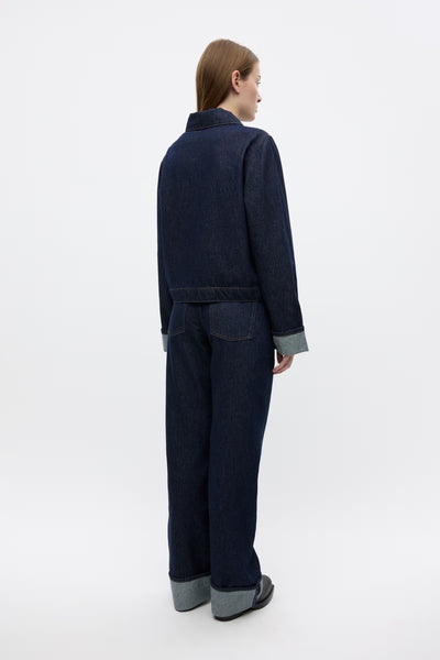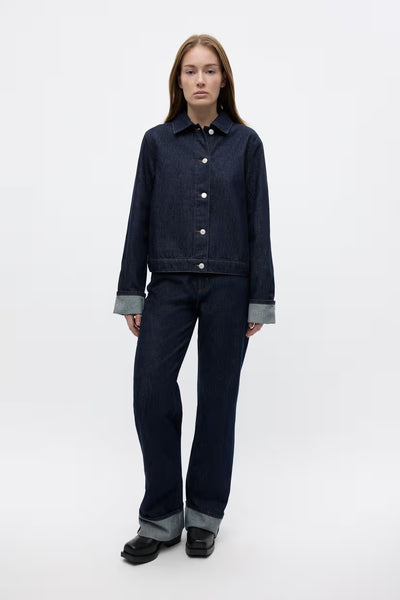 Donkerblauw denim jasje. Biologisch katoen met donkerblauwe spoeling en contrasterende stiksels. Normale kraag en knoopsluiting. Lange mouwen met omgeslagen manchetten. Merkknopen met zilverkleurige afwerking. Normale pasvorm.