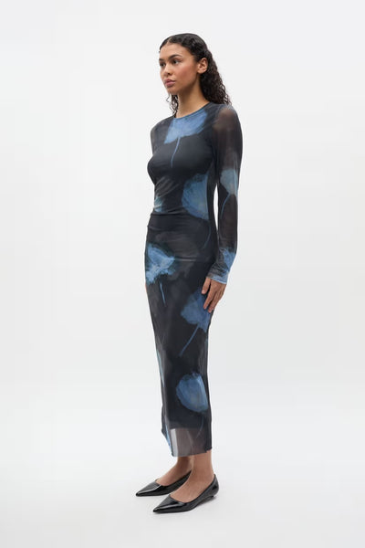 Maxi mesh jurk met patroon. Transparante elastische mesh met all-over patroon. Ronde hals en lange mouwen. Rimpels in de zijnaad voor een gerimpeld effect. Ruwe rand aan de mouwuiteinden en zoom. Gevoerd lijfje. Slim fit.