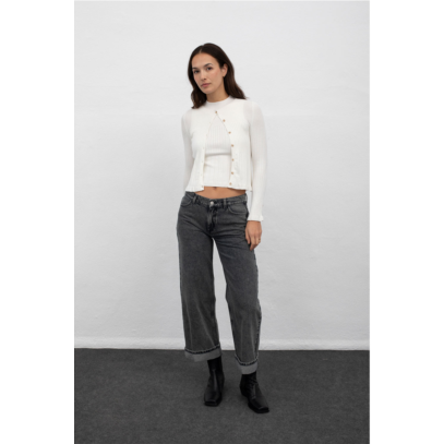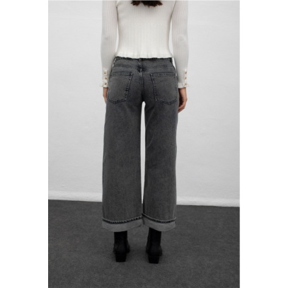 Jeans met lage taille, wijde pijpen en een naar buiten gevouwen zoomdetail. Klassieke zakken en vijf riemlussen. Perfect voor een relaxte, moderne stijl.