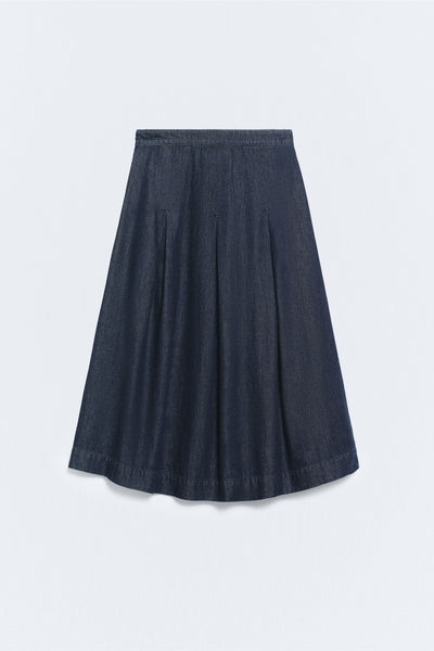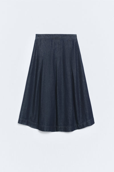 Geplooide denim midirok. Ongevoerd. Uitlopende pasvorm. Ritssluiting aan de zijkant. Stijltip: kies een maat groter voor een lage taille. Kan afgeven op lichte oppervlakken. Lengte kledingstuk voor maat S: 78 cm.