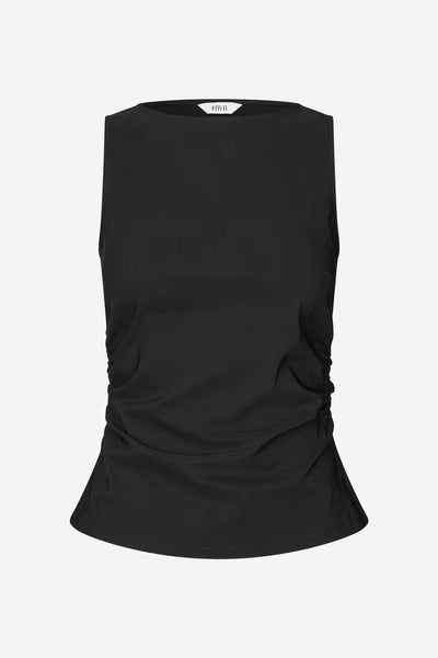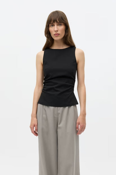 Mouwloze top met geplooide zijkanten. Gladde, lichte stof met een licht glanzende afwerking. Ronde hals en elastische, geplooide zijnaden die een geplooid effect creëren. Borstplooien. Nauwsluitende pasvorm.