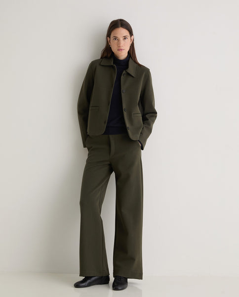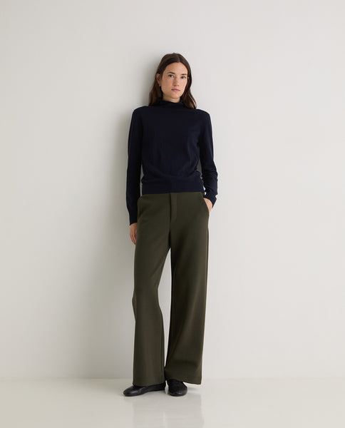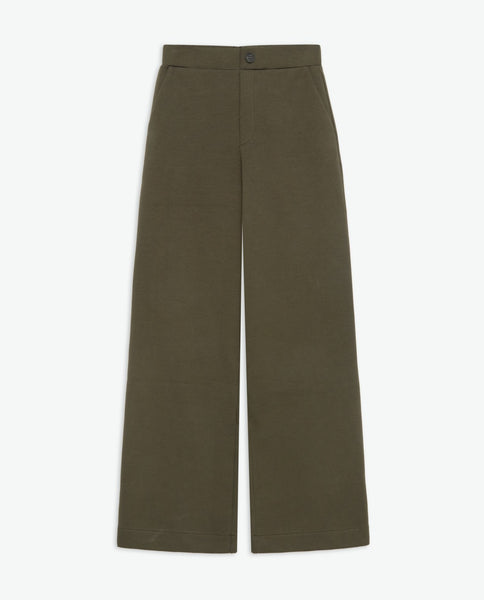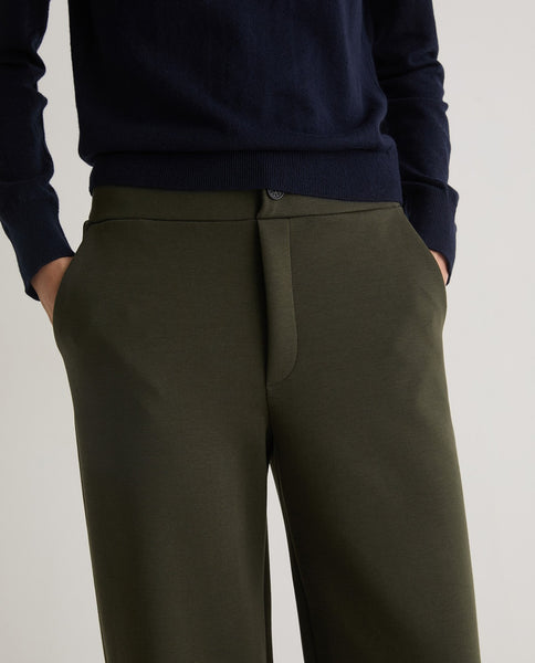 Stretchbroek. Katoenmix. Wijde snit. Zonder sluiting. Decoratieve knoop. Elastische tailleband. Twee steekzakken en twee paspelzakken achter.