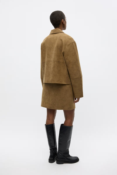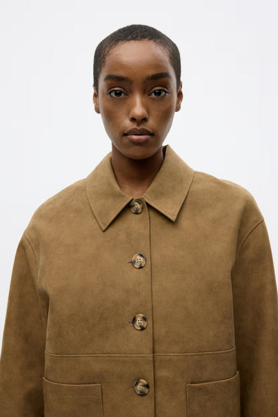 Boxy jasje met knopen. Zacht en glad imitatieleer met een licht vintage effect. Normale kraag en knoopsluiting. Twee zakken aan de voorkant. Volledig gevoerd. Recht, boxy silhouet.