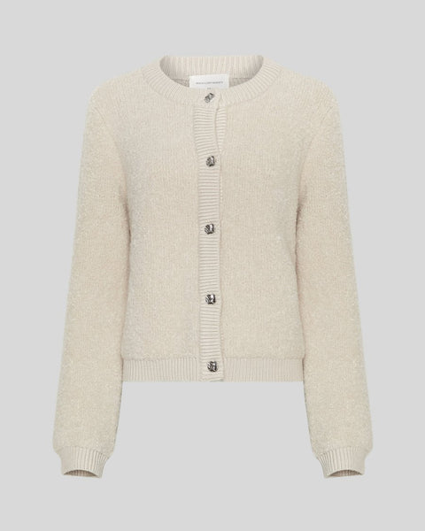 Deze cardigan heeft een boxy fit, met geribbelde randen voor een contrasterend detail. De cardigan heeft contrasterende knopen en is dubbel gebreid, wat betekent dat de binnenkant klassiek gebreid is, maar de buitenkant meer wollig. Het model is 175 cm lang en draagt maat S/M.