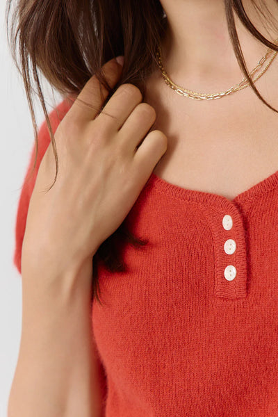 Fijngebreide trui met korte mouwen en een ronde hals met knoopjes. Een vintage touch die je bij al je looks kunt verwerken.
