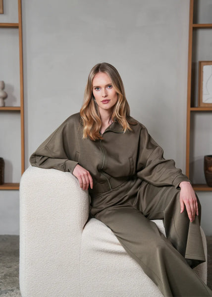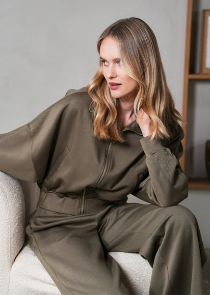 Gemaakt van een zachte, stretchy modalblend, voelt het heerlijk soepel aan en beweegt het moeiteloos met je mee. De relaxte fit, ritssluiting en elastische tailleband zorgen voor een moderne, comfortabele look die je zowel thuis als onderweg kunt dragen.